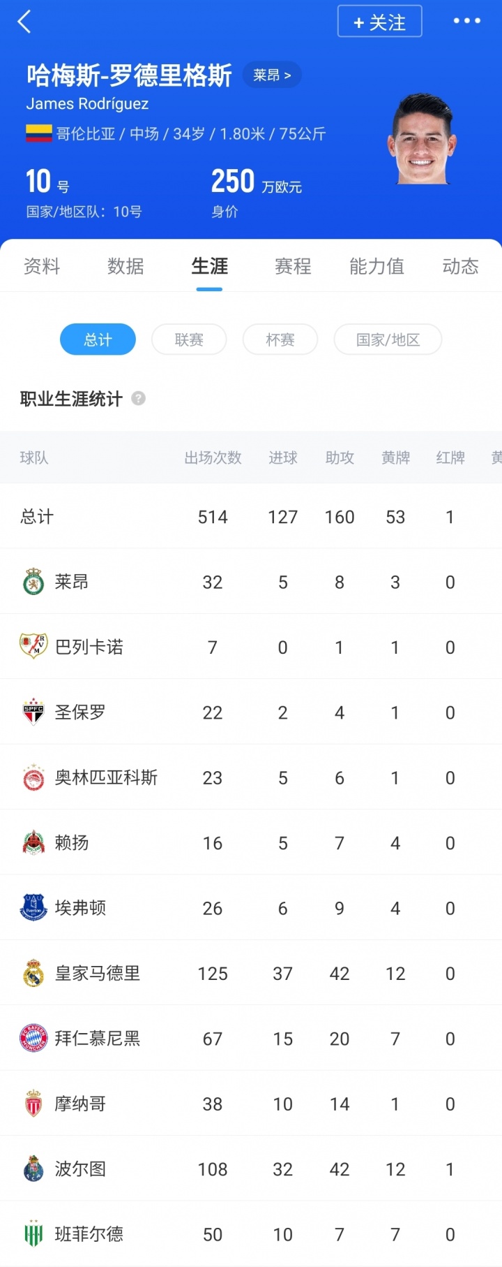 现年34岁的J罗,生存曾效劳皇马、摩纳哥、拜仁、埃弗顿等队,巅峰身价曾达到8000万欧,如今身价仅剩250万欧。