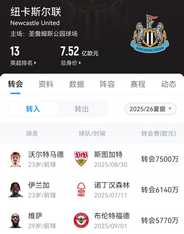 新赛季运行,来自德甲的沃尔特马德进展可以,代表纽卡出战12场比赛孝顺6球。但另外两东谈主的进展则难以让东谈主知足,维萨因膝重要伤病于今仍未复出;伊兰加英超10轮比赛,仍然0球0助,仅在欧冠中送出一次助攻。