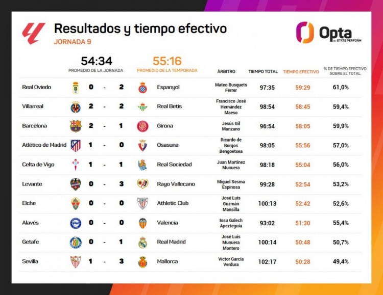10月21日讯 OPTA统计了西甲第九轮各场比赛的灵验时分,莫得任何一场比赛的灵验时分逾越60分钟。