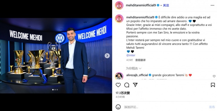 “海外米兰将永久留在我心中。带着戴德之情,我向你们所有东谈主告别,并祝贺你们改日取得更多荣誉!满怀情感地这样作念。——梅赫迪-塔雷米。”