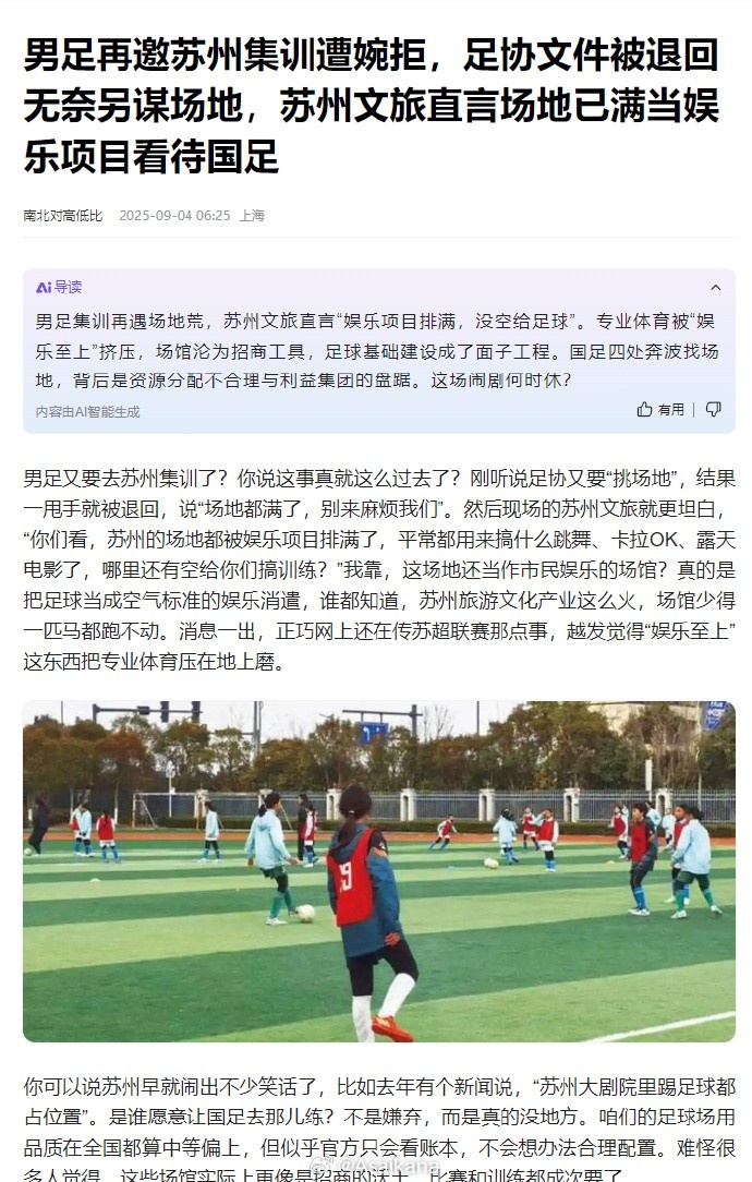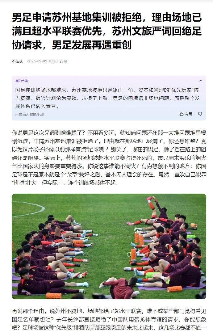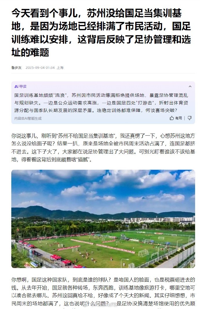 不少自媒体近日又假造持造了“国足9月到苏州集训,苏州以局面病笃优先供给全球使用为由拒却”的废话。且不说现在国足主帅尚未落实,最近也无集训策动(早在年头就公布了集训策动),这个废话显得假到离谱。