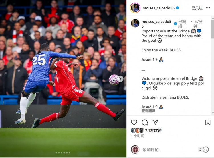 凯塞多社媒晒出比赛相片,并写说念:“在斯坦福桥赢得进攻告捷,为球队感到自尊,为进球感到欣喜。享受这个周末吧,蓝军球迷们。”