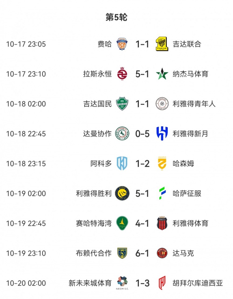 10月20日讯 沙特联第五轮,共有40粒进球产生,仅利雅得月牙完成零封。