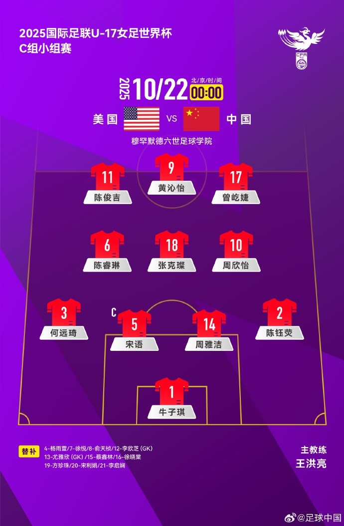 10月21日讯 2025海外足联U-17女足宇宙杯C组小组赛第2轮,好意思国队VS 中国队首发名单出炉!