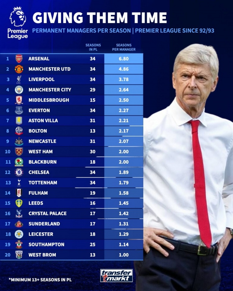 英超各队历任主帅平均捏教时长:阿森纳、曼联、利物浦、曼城前四