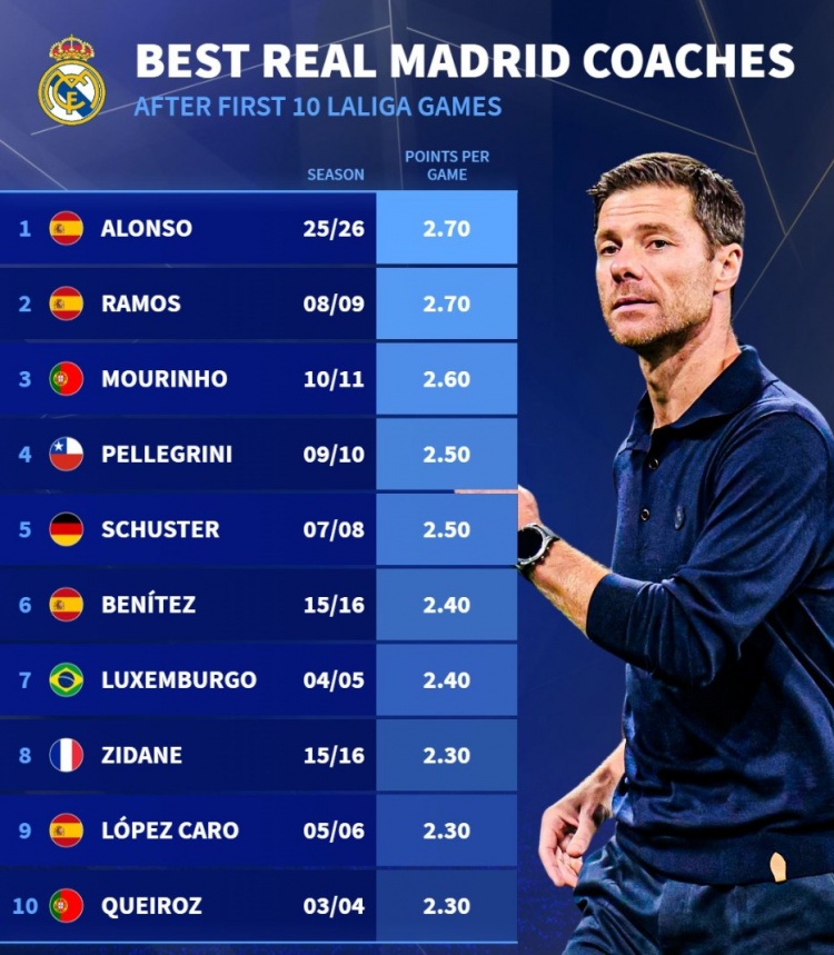 皇马主帅前10场西甲场均拿分榜:阿隆索2.7分并排居首,穆帅第3