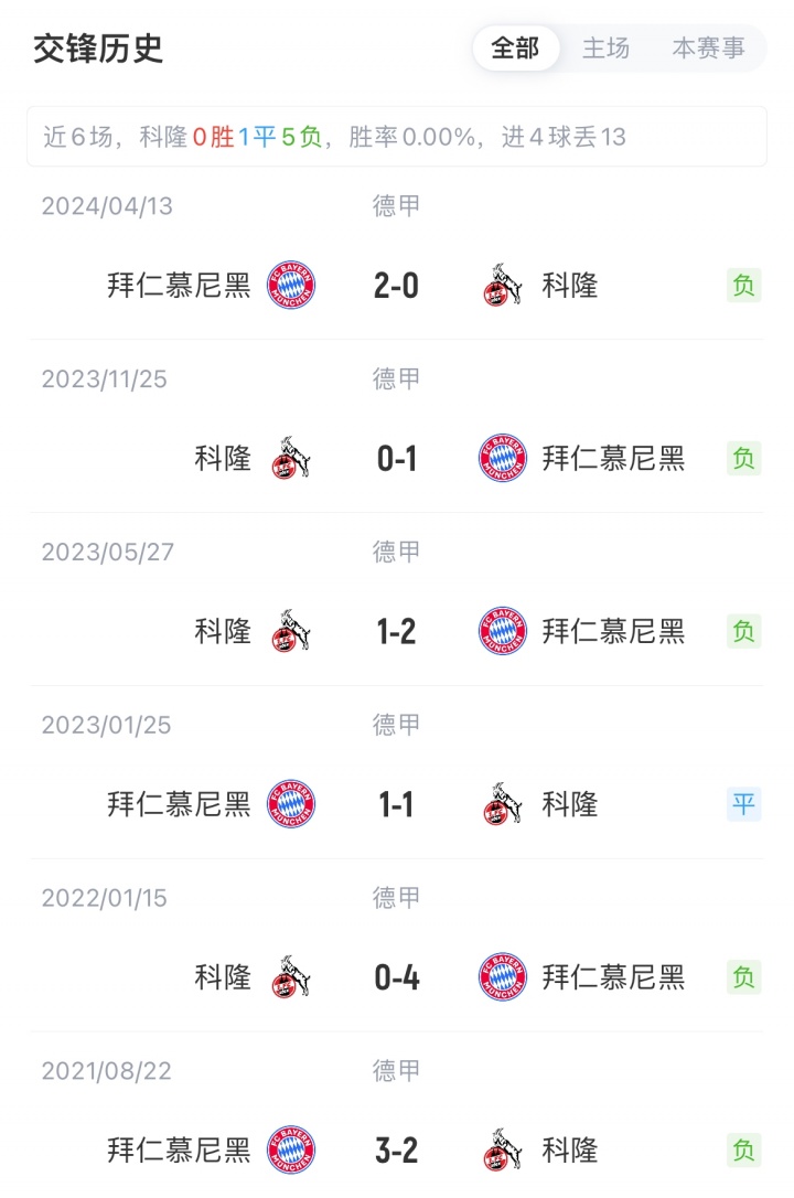 拜仁联赛8轮全胜积24分位居德甲榜首,开季13场全胜;科隆联赛3胜2平3负积11分暂位德甲第8,近2轮不堪。拜仁对阵科隆已衔接20场不败(18胜2平)。