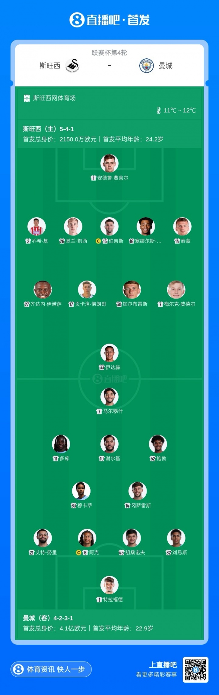 10月30日讯 联赛杯第4轮,曼城客战斯旺西,赛前首发公布。谢尔基、马尔穆什先发,哈兰德伤缺。