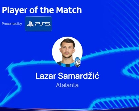 本场比赛亚特兰大球员萨马尔季奇在89分钟献艺绝杀,赛后当选欧冠官方评比出的本场最好球员。