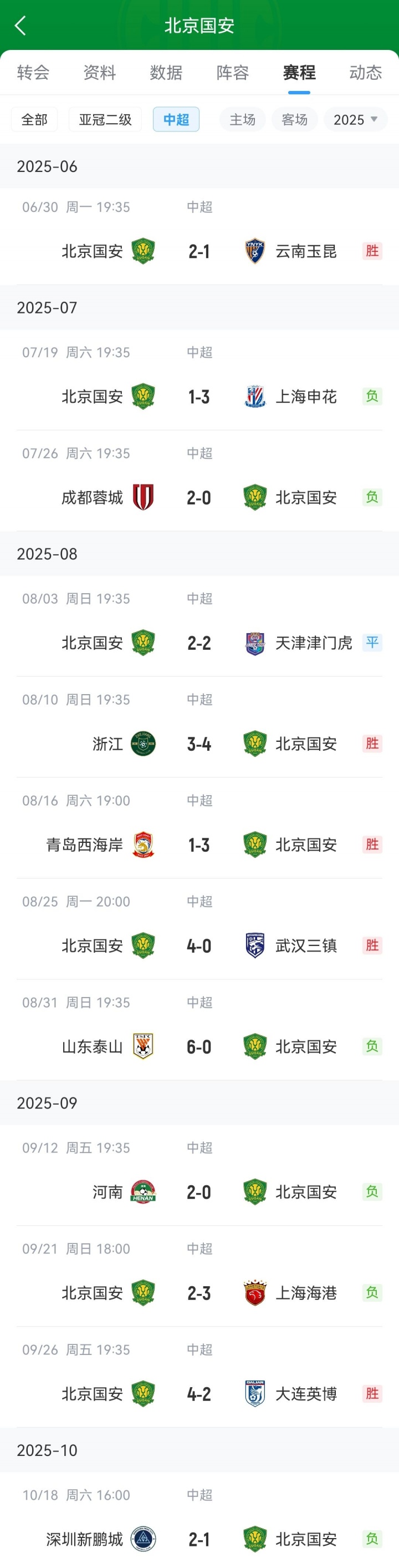 半程冠军崩盘😴国安中超上半程0负领跑 下半程12场吞6负掉队