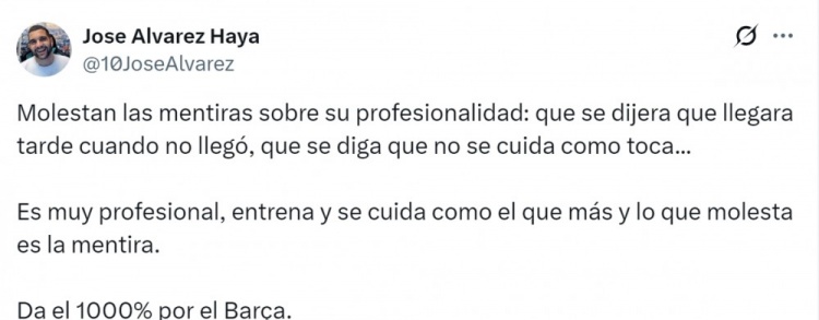 Jose Alvarez Haya社媒写说念:“漫骂亚马尔做事格调的谣喙令东说念主恼火——他明明莫得迟到,却被传迟到,还被说疏于自我解决。”