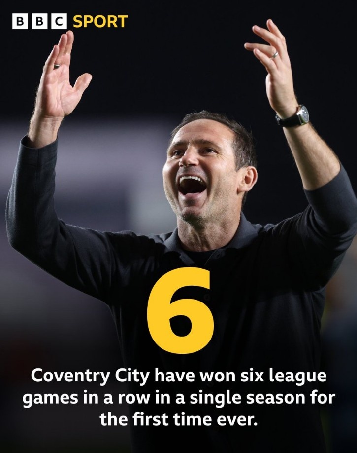 兰帕德率队创造历史,考文垂队史初度在单赛季得到联赛6连胜
