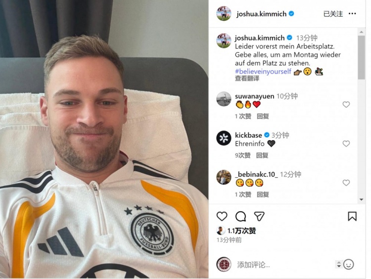 基米希社媒晒出我方在医疗室的相片,并写说念:“缺憾的是这里暂时成为了我的责任口头,我会养精蓄锐,争取鄙人周一(对阵斯洛伐克)重返赛场。”