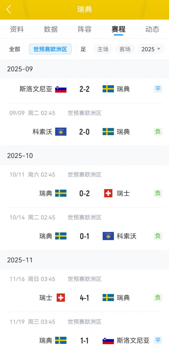 6场小组赛中,队内不乏球星的瑞典两次战平斯洛文尼亚,遭到瑞士和科索沃的双杀,只拿到2个积分。