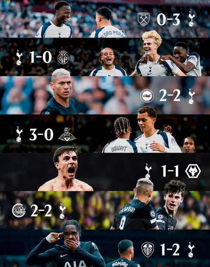 赛后热刺官方晒出了球队近期的战绩:3-0西汉姆、1-0比利亚雷亚尔、2-2布莱顿、3-0唐卡斯特流浪、1-1狼队、2-2博德耀眼、2-1利兹联。