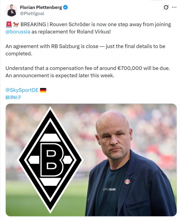 媒体指出,门兴罕见聘用萨尔茨堡总监施罗德,让其成为俱乐部的新任总监,以替代离任的维尔库斯,门兴接近与萨尔茨堡结束合同,只剩临了细节有待敲定,赔偿金约为70万欧,瞻望本周晚些技术官宣。