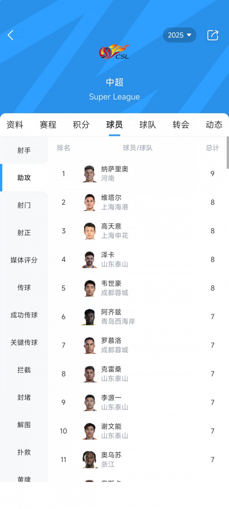 现在中超助攻榜↓