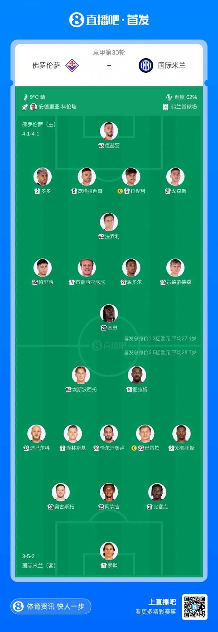 佛罗伦萨首发阵容:43-德赫亚、21-戈森斯、6-拉涅利、5-庞格拉西奇、2-多多、10-古德蒙德森、27-恩多尔、44-法乔利、4-布雷西亚尼尼、65-帕里西、20-基恩