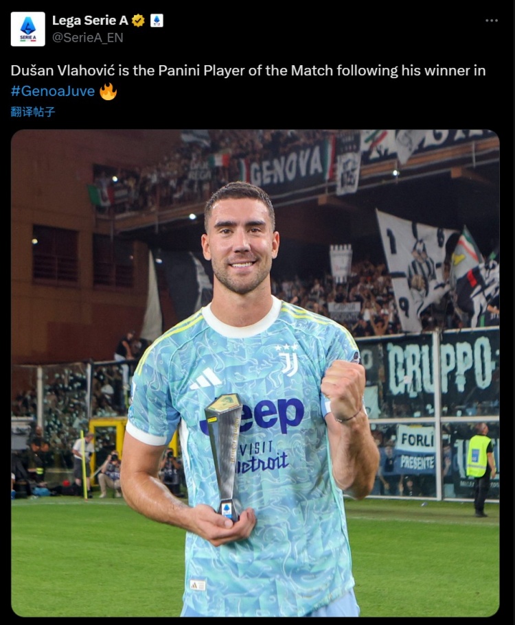 替补头槌打进制胜球!官方:弗拉霍维奇当选尤文vs热那亚全场最好