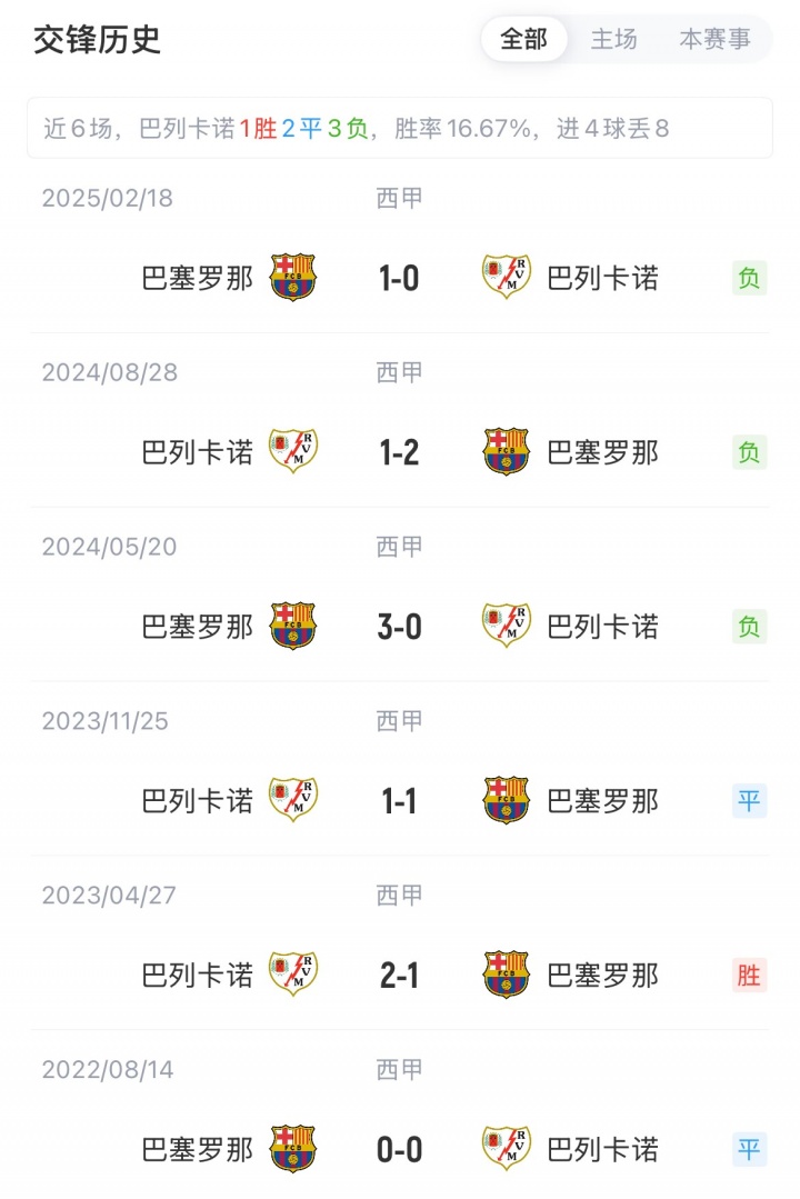 巴萨开局两连胜,巴列卡诺1胜1负。径直对决中,巴萨对巴列卡诺已三连胜。