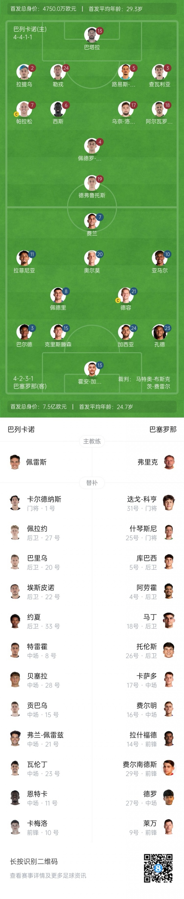巴列卡诺首发:13-巴塔拉、2-拉蒂乌、3-查瓦利亚、5-路易斯-费利佩、24-勒戎、4-佩德罗-迪亚兹、6-西斯、17-乌奈-洛佩斯、18-阿尔瓦罗-加西亚、7-帕拉松、19-德弗鲁托斯