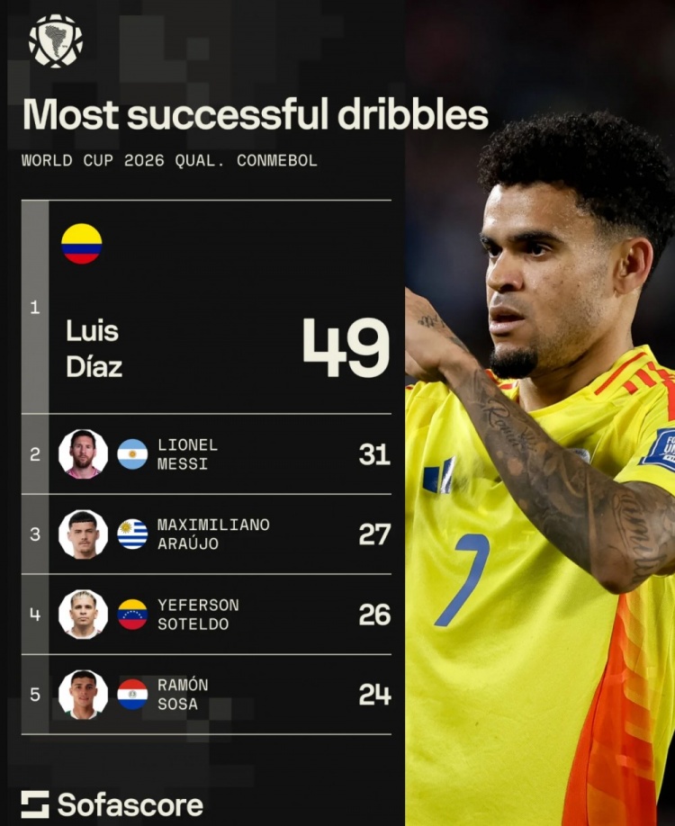 本届南好意思世初赛成效过东说念主榜:迪亚斯49次居首,梅西31步骤二